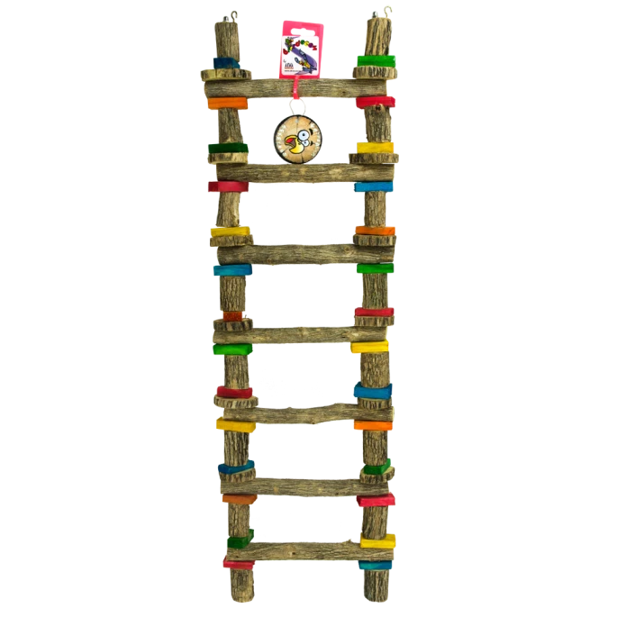 Deze kleurrijke ladder met een natuurlijke uitstraling is geschikt voor grote vogels. Eenvoudig op te hangen door de meegeleverde haakjes. Ook te gebruiken als in- en uitstaphulp.