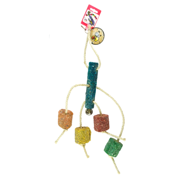 Klim- speeltouw met coral/zandstructuur! Draagt bij aan het onderhoud van de pootjes en snavel van uw vogel. U kunt zelf bepalen op welke hoogte de coral/zandstructuurballen komen te hangen door ze te verschuiven. Dit speeltje is makkelijk te monteren met behulp van het karabijnhaakje.