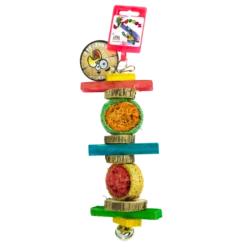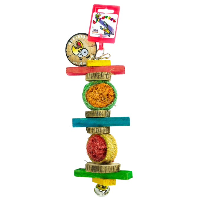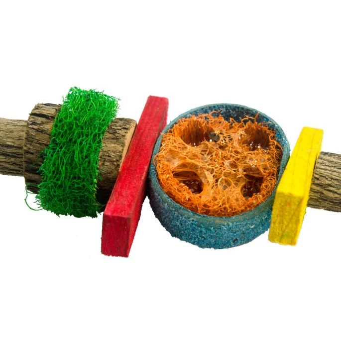 Draagt bij aan het onderhoud van de pootjes en snavel van uw vogel. Makkelijk te monteren met behulp van het karabijnhaakje. Bevat luffa, rondjes met zandstructuur, gekleurd hout en een leuke bel aan de onderzijde voor extra speelplezier.