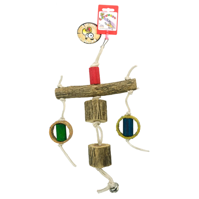 Klim- speeltouw inclusief coral/zandstructuur cilinders! De coral/zandstructuur cilinders dragen bij aan het onderhoud van de pootjes en snavel van uw vogel. Dit speeltje bevat Sekelbos (hout), cilinders met coral/zandstructuur, T-Pillar lederen touw en een leuke bel aan de onderzijde voor extra speelplezier. Het speeltje is makkelijk te bevestigen d.m.v. het karabijnhaakje.