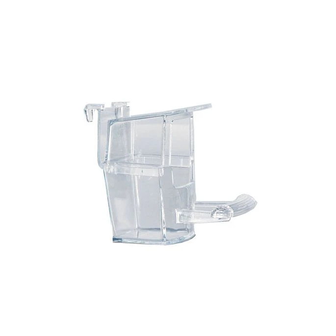Een voerbakje voor in de vogelkooi. Het bakje is voorzien van ophanghaakjes, maar kan ook op de grond geplaatst worden.