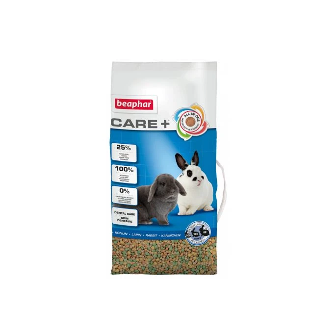 • natuurlijke slijtage tandenCare+ wordt direct geaccepteerd. Het is echter zeer belangrijk om geleidelijk naar een nieuw voer over te schakelen. De eerste dagen kunt u Care+ dan ook het beste mengen met het oude voer. De aanbevolen hoeveelheid Care+ per dag is afhankelijk van de grootte en het gewicht van uw konijn: Klein/Mini Pooltje & Nederlandse Dwerg ca. 60g, Nederlandse Dwerghangoor ca. 85g, Rex ca. 115g, Franse hangoor, Vlaamse Reus & Belgische Haas 170-450g, Engelse Reus 340-450g bij voorkeur te verdelen over 2 voedingen. Geef iedere dag schoon en fris drinkwater en zorg ervoor dat het konijn onbeperkt hooi ter beschikking heeft!Care+ wordt direct geaccepteerd. Het is echter zeer belangrijk om geleidelijk naar een nieuw voer over te schakelen. De eerste dagen kunt u Care+ dan ook het beste mengen met het oude voer. De aanbevolen hoeveelheid Care+ per dag is afhankelijk van de grootte en het gewicht van uw konijn: Klein/Mini Pooltje & Nederlandse Dwerg ca. 60g, Nederlandse Dwerghangoor ca. 85g, Rex ca. 115g, Franse hangoor, Vlaamse Reus & Belgische Haas 170-450g, Engelse Reus 340-450g bij voorkeur te verdelen over 2 voedingen. Geef iedere dag schoon en fris drinkwater en zorg ervoor dat het konijn onbeperkt hooi ter beschikking heeft!Samenstelling: Plantaardige bijproducten, granen, groenten, mineralen, zaden, gist, Yucca Schidigera, algen (Spirulina 0,01%).