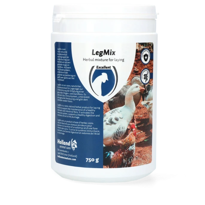 LegMix is een 100% natuurlijk kruidenproduct voor legvogels ter ondersteuning en het behoud van een gezonde maag- en darmflora. Het activeert het afweersysteem, ondersteunt een gezonde spijsvertering en geeft weer glans aan het verenkleed. LegMix is geschikt voor kippen, eenden, ganzen, kwartels en andere legvogels.