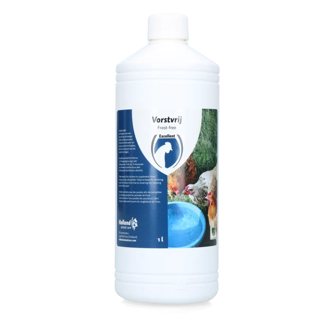 Vorstvrij voor kippen is een voedermiddel voor kippen voor een aanvulling van energie tijdens koude periodes. Vorstvrij helpt het drinkwater van kippen vorstvrij te houden, door het vriespunt van het water te verlagen. Dit voedermiddel bevat glycerine en is gemakkelijk te gebruiken. Los 1 deel Vorstvrij op in 4 delen drinkwater. Voor één liter drinkwater gebruikt u dus 200 ml Vorstvrij en 800 ml water. Vorstvrij is te gebruiken voor een periode tot 14 achtereenvolgende dagen en biedt de mogelijkheid tot vers drinkwater tot -9 ℃.