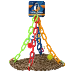 Bestaat uit zeegras en allerlei leuke kunststof details. De haak zorgt ervoor dat het veilig en zeker opgehangen kan worden in de kooi.