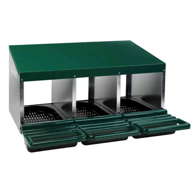 Inclusief een voor pluimvee onbereikbare opvangbak met deksel ter bescherming van de eieren. Geschikt voor tot 15 kippen.