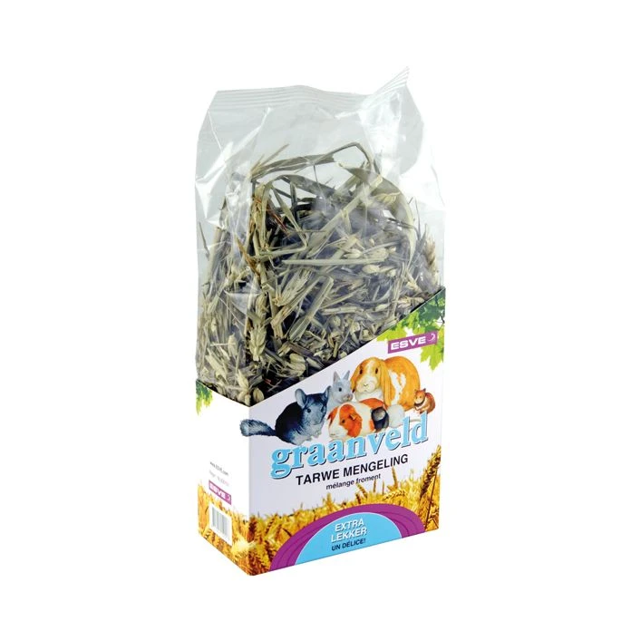 ESVE Graanveld Tarwemengeling komt direct van het land en bevat een hoog percentage natuurlijke vezels. Dit zorgt voor een goede spijsvertering bij knaagdieren en konijnen. Hoe beter de spijsvertering, des te meer het dit de gezondheid van uw huisdier bevordert.Voedingsadvies: naar behoefte naast de gewone voeding.Samenstelling: Alfagras, peterselie, tarwe, haver en korenbloemen
