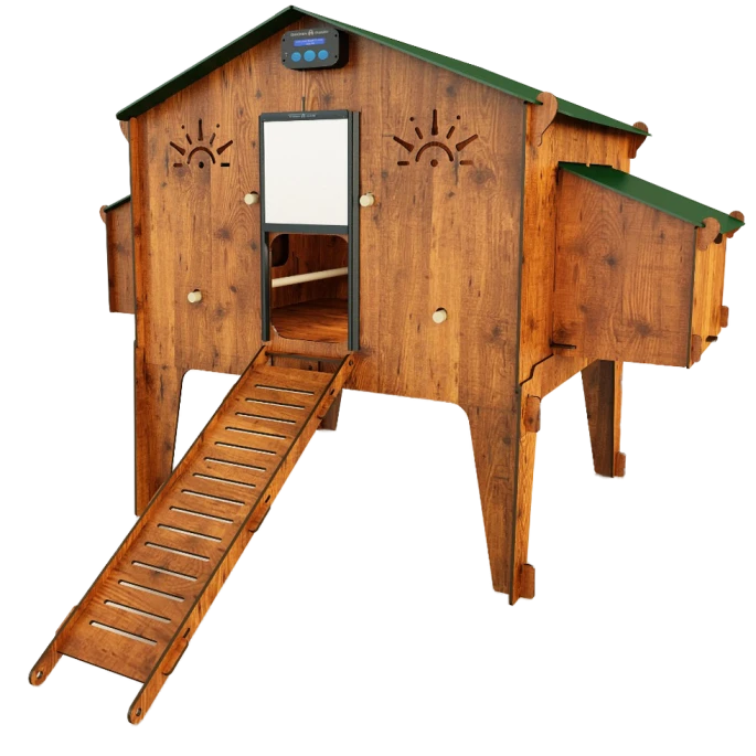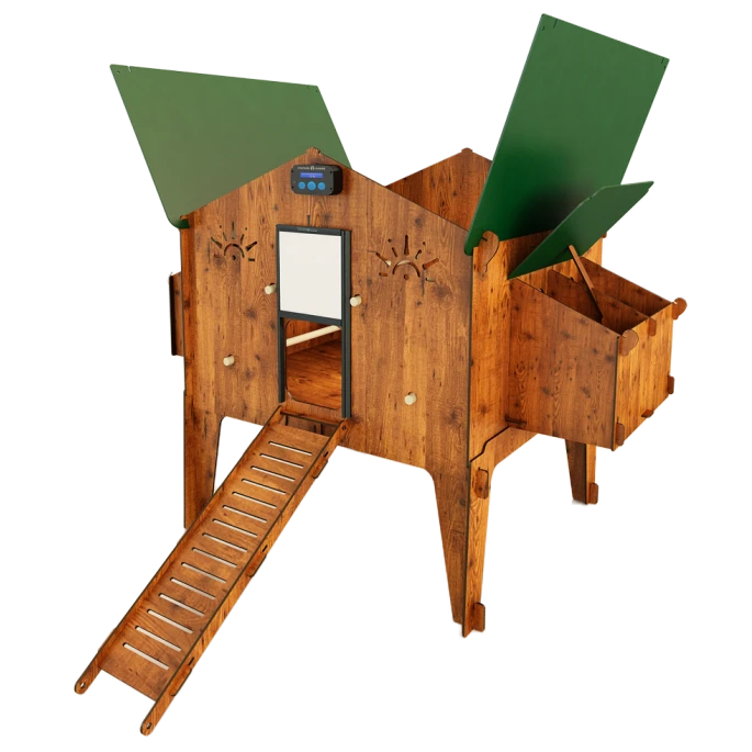 Door het in elkaar grijpend systeem is het hok zonder enige benodigdheden te monteren en te demonteren. Aan de achterkant van het hok bevindt zich een gleuf, waardoor het mogelijk is om het hok op te tillen en zo schoon te maken. Doordat het hok op poten staat en zich zo’n 50 cm boven de grond bevindt, is er alle ruimte voor de kippen om te schuilen bij regenachtig weer. Daarnaast kunnen ze het hok gemakkelijk betreden via de ladder. In het hok bevinden zich 4 zitstokken en er zijn 4 nestplaatsen, twee aan elke zijkant van het hok. Deze kunnen handmatig verwijderd worden om schoon te maken.