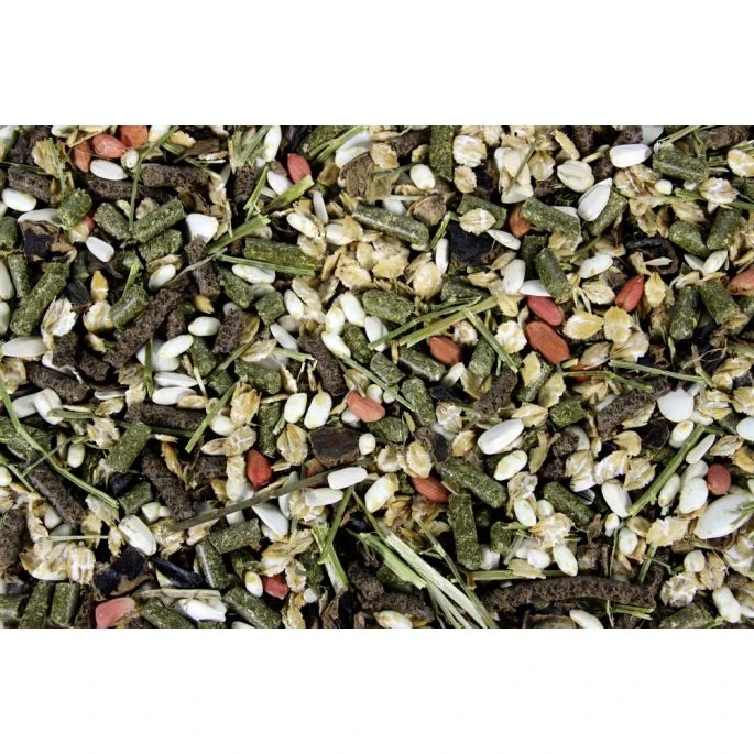 Gerstvlokken. luzernekorrels. johannesbrood. lijnzaadbrokjes. pompoenpitten. zonnepitten. gepelde pinda’s. rijst.