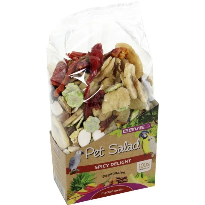 ESVE Pet Salad – Spicy Delight is een uitgekiend recept van fruit, vruchten en groenten. Papegaaien vinden het heerlijk en bovendien zijn deze hoogwaardige ingrediënten erg gezond.