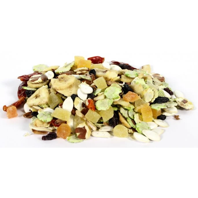 gedroogde banaan. erwtenvlokken. bonenvlokken. pompoenpitten. papaja. ananas. rozijnen en rode Chilipepers.