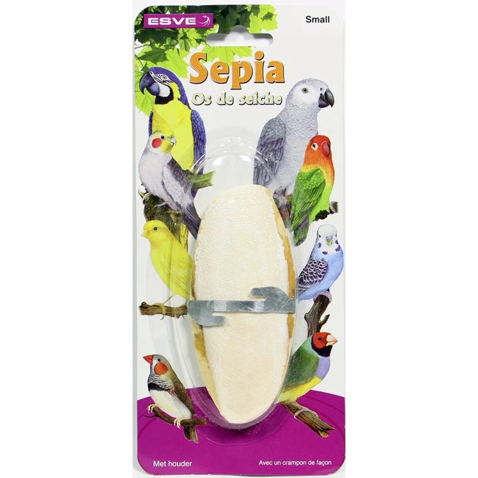 ESVE sepia is 100% natuurlijk en voorziet uw vogel(s) van onmisbare calcium en mineralen. Het is goed voor de bloedsomloop, het skelet en de eierschalen. Sepia heeft ook een “slijpfunctie“ waardoor snavel van de vogel scherp blijft. Wordt geleverd met houder om deze gemakkelijk aan binnenzijde van de kooi te bevestigen.