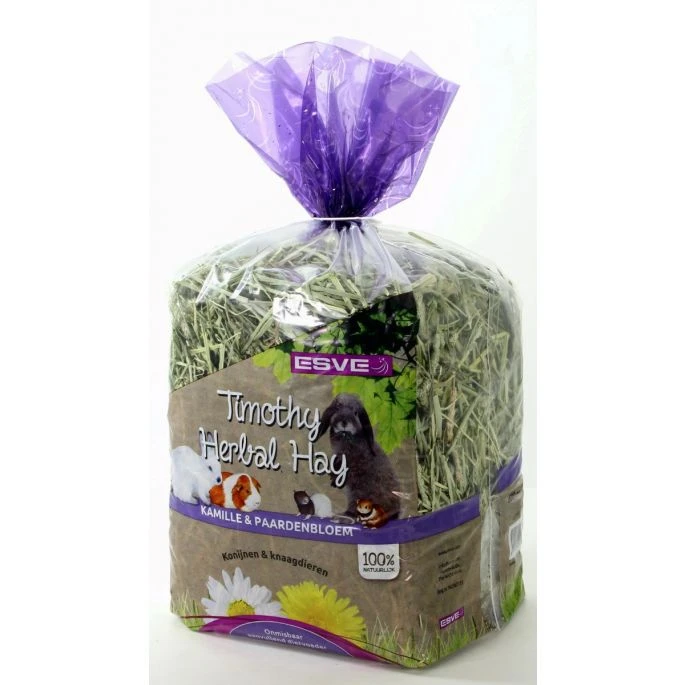 Timothy Herbal Hay van ESVE is een grassoort uit het zonnige en warme Midden- Canada. Het landklimaat maakt, in combinatie met de warmte van de zon in het voorjaar en de zomer, deze hooisoort zeer smakelijk en groen. Timothee hooi is zeer geliefd bij knaagdieren en konijnen. De rijke hoeveelheid voedingsvezels, voornamelijk in de stengels, bevorderen bovendien de spijsvertering bij uw huisdier.