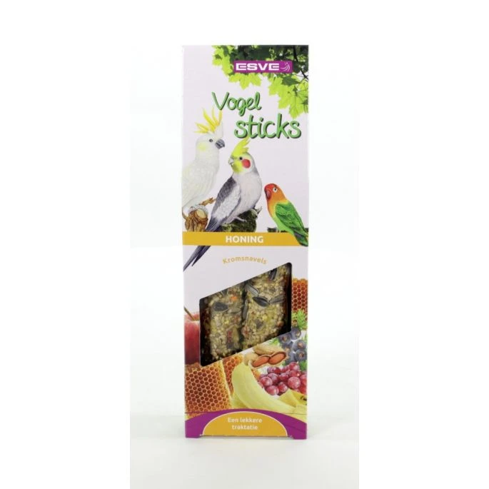 ESVE sticks zijn smaakvolle voedings- en traktatie stangen, boordevol belangrijke voedingsstoffen, geheel afgestemd op de behoefte van uw vogel(s). Bij de samenstelling is o.a. gebruik gemaakt van de zaden en grondstoffen die de vogel ook in de vrije natuur tot zich neemt, aangevuld met de noodzakelijke vitamines, die de weerstand verhogen en bijdragen aan een gezonde vogel met een mooie vederpracht.