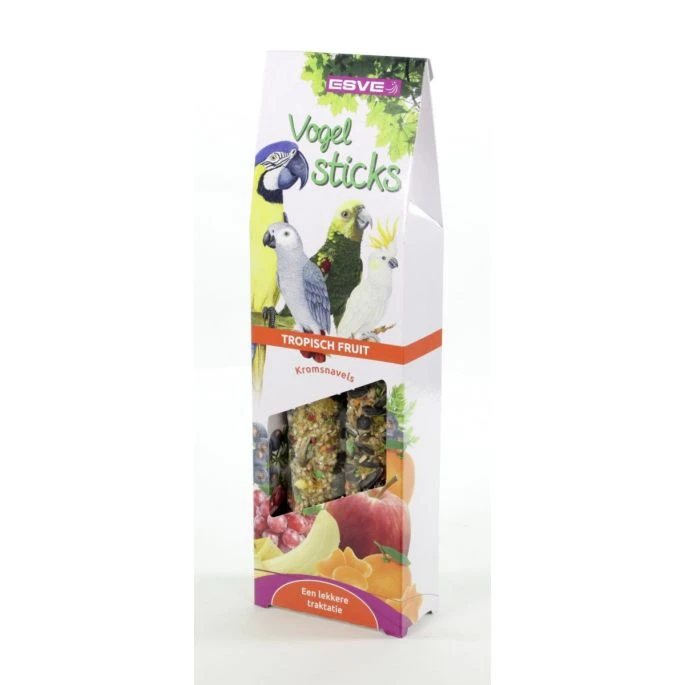ESVE sticks zijn smaakvolle voedings- en traktatie stangen, boordevol belangrijke voedingsstoffen, geheel afgestemd op de behoefte van uw vogel(s). Bij de samenstelling is o.a. gebruik gemaakt van de zaden en grondstoffen die de ook in de vrije natuur tot zich neemt, aangevuld met de noodzakelijke vitamines, die de weerstand verhogen en bijdragen aan een gezonde vogel met een mooie vederpracht.